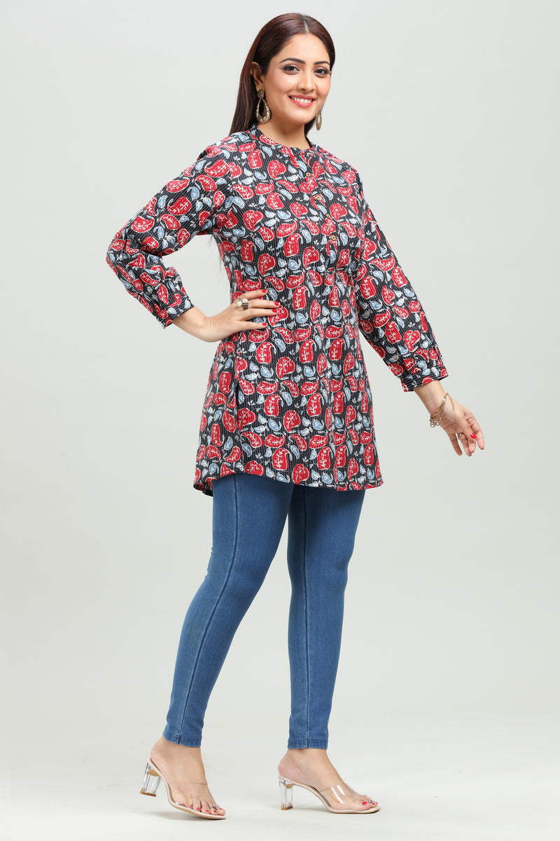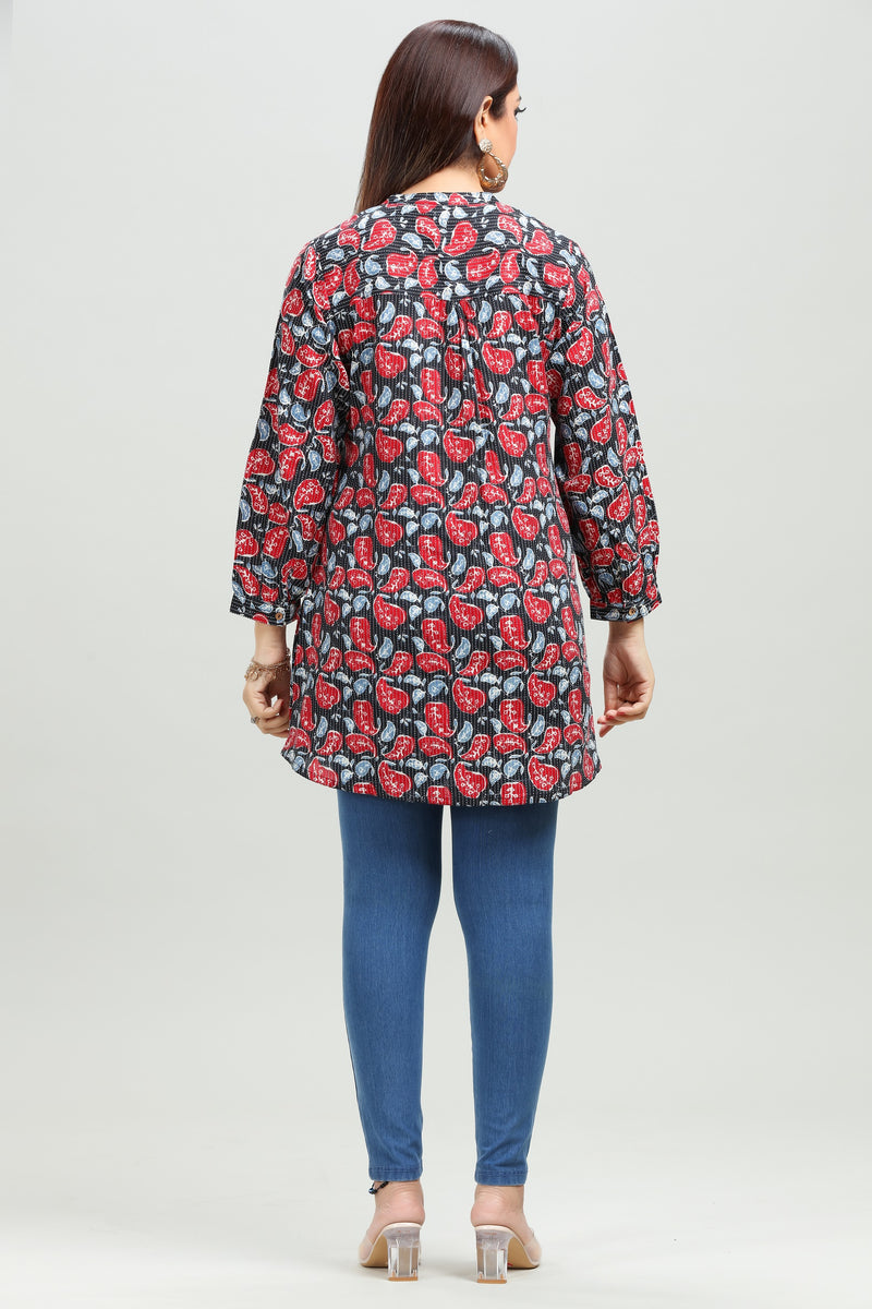 Expertly crafted from handloom cotton, this black printed short kurta is a must-have for any wardrobe. With its straight cut and unique print, this kurta offers both style and comfort. Elevate your look with this versatile and fashionable piece.
