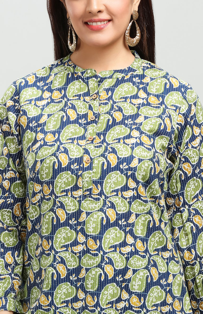 Blue & Green Handloom Cotton Straight Printed Short Kurta