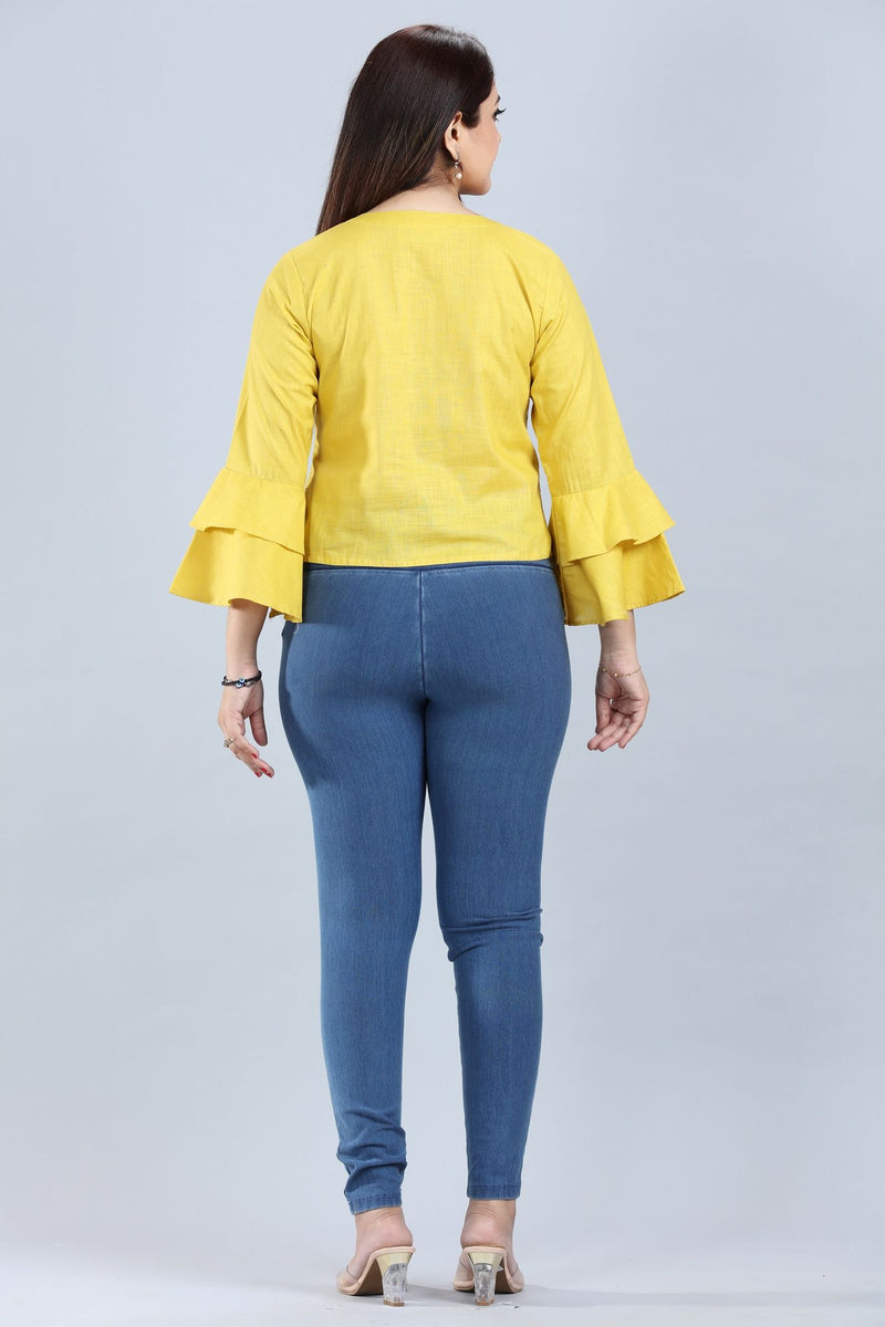 Using this bright yellow cotton kurti will add an explosion of brightness to your outfit! It's ideal for festive fun or informal get-togethers because of its beautiful embroidery and comfortable short length.