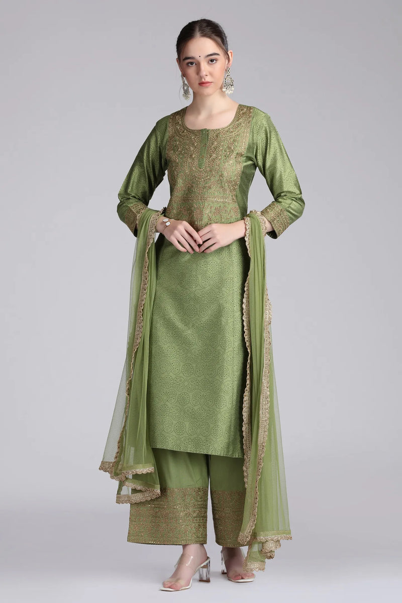Elevate your ethnic wardrobe with this Light Green PolySilk Suit Set featuring an embroidered straight kurta, matching pant, and dupatta. Crafted from smooth poly silk, the ensemble offers a refined drape and subtle sheen, while intricate embroidery adds elegant detailing. Designed for comfort and sophistication, this set suits both festive occasions and formal gatherings, ensuring a graceful and polished appearance.