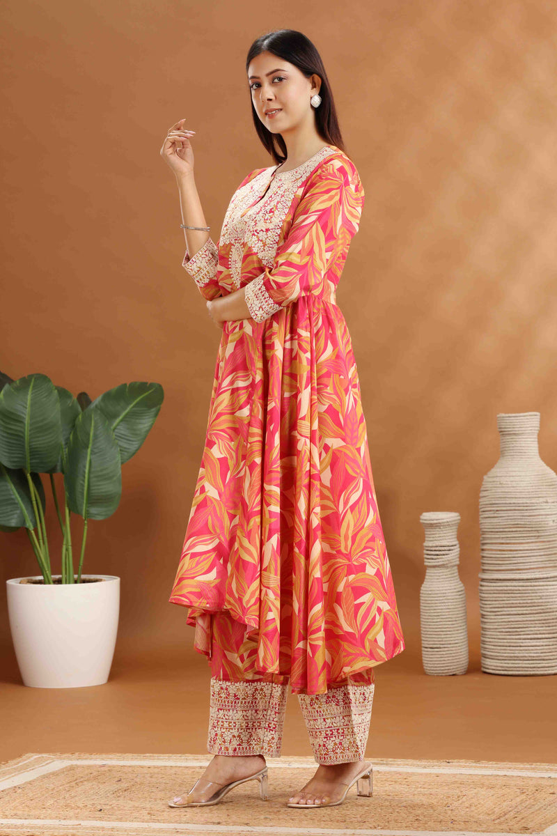 Orange Roman Silk Embroidered & Digital Print A Line Kurta and Pant Set