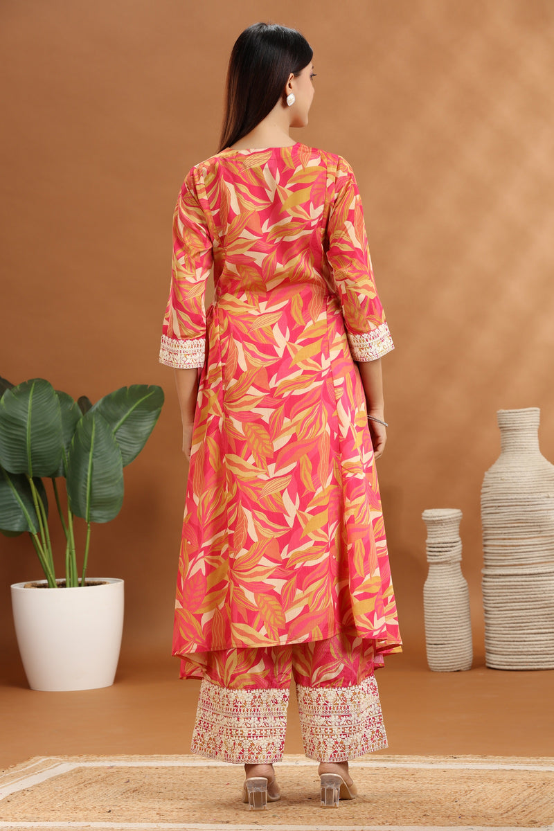 Elevate your ethnic wardrobe with Cotton Culture's Orange Roman Silk Embroidered & Digital Print A Line Kurta and Pant Set. The luxurious Roman silk fabric and intricate embroidery add a touch of elegance, while the digital print adds a modern twist. Perfect for any occasion, this set will make you stand out with its unique design.