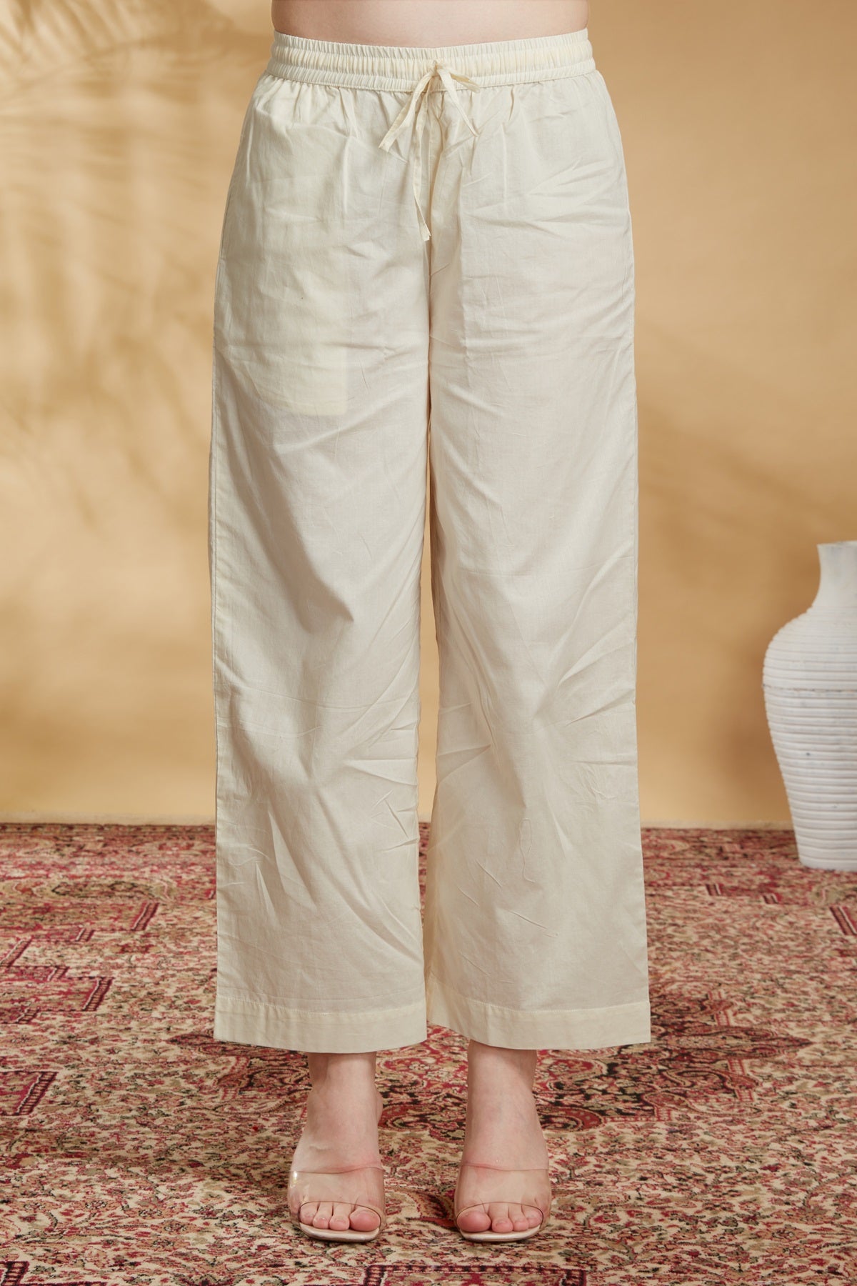 Cream Cotton Embroidered A Line Kurta Pant and Dupatta Suit Set