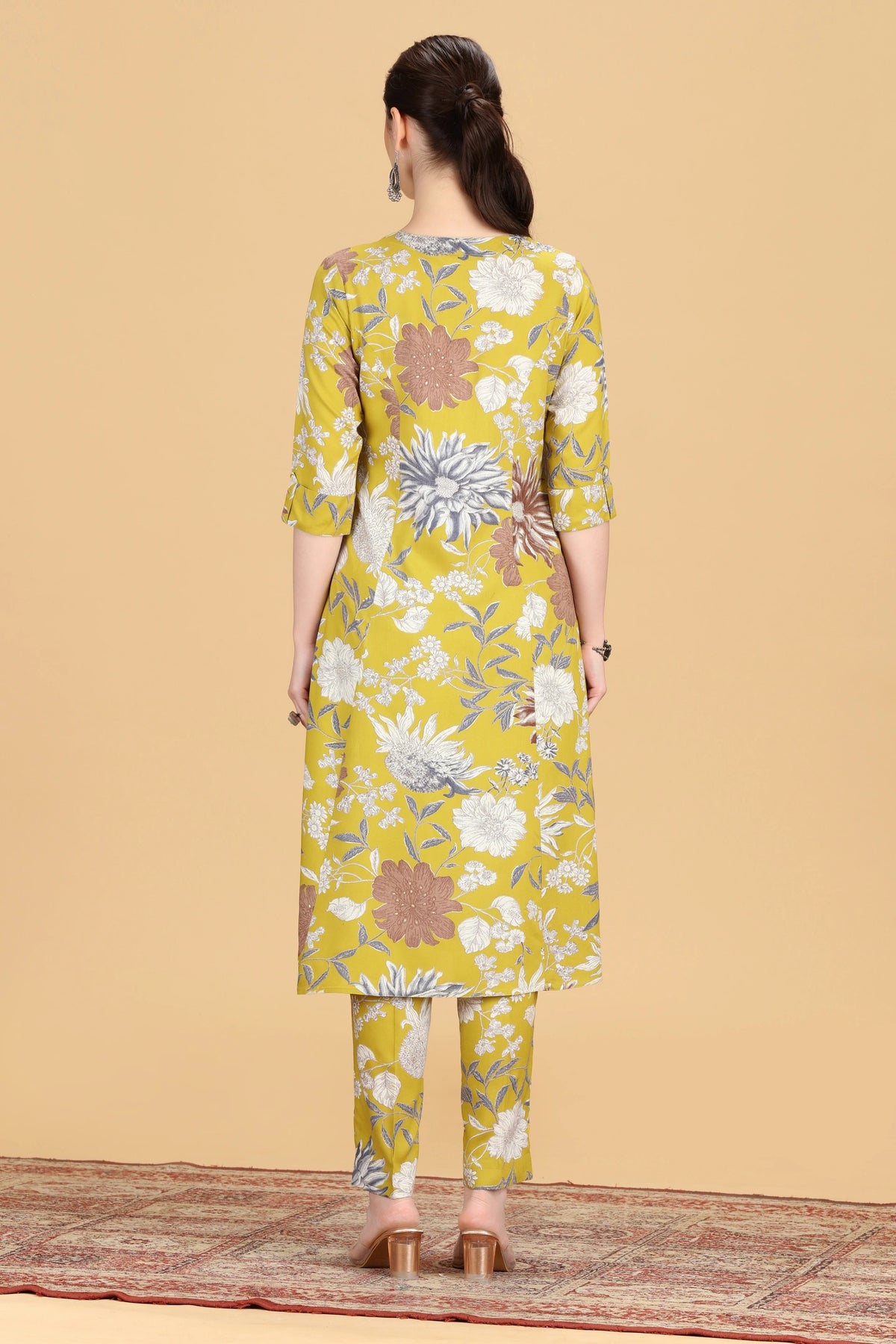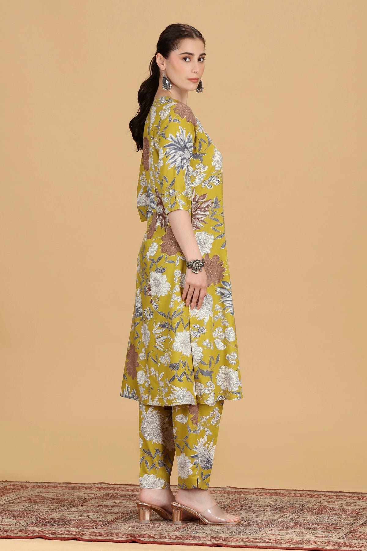 This Dark Mustard Cotton Floral Printed A-Line Kurta and Pant Co-ord Set combines timeless elegance with comfort. Crafted from breathable cotton, it features a flattering A-line kurta adorned with delicate floral prints, paired with matching pants for a cohesive look. Ideal for casual outings or festive occasions, this set ensures ease of movement while delivering a polished appearance with minimal effort.