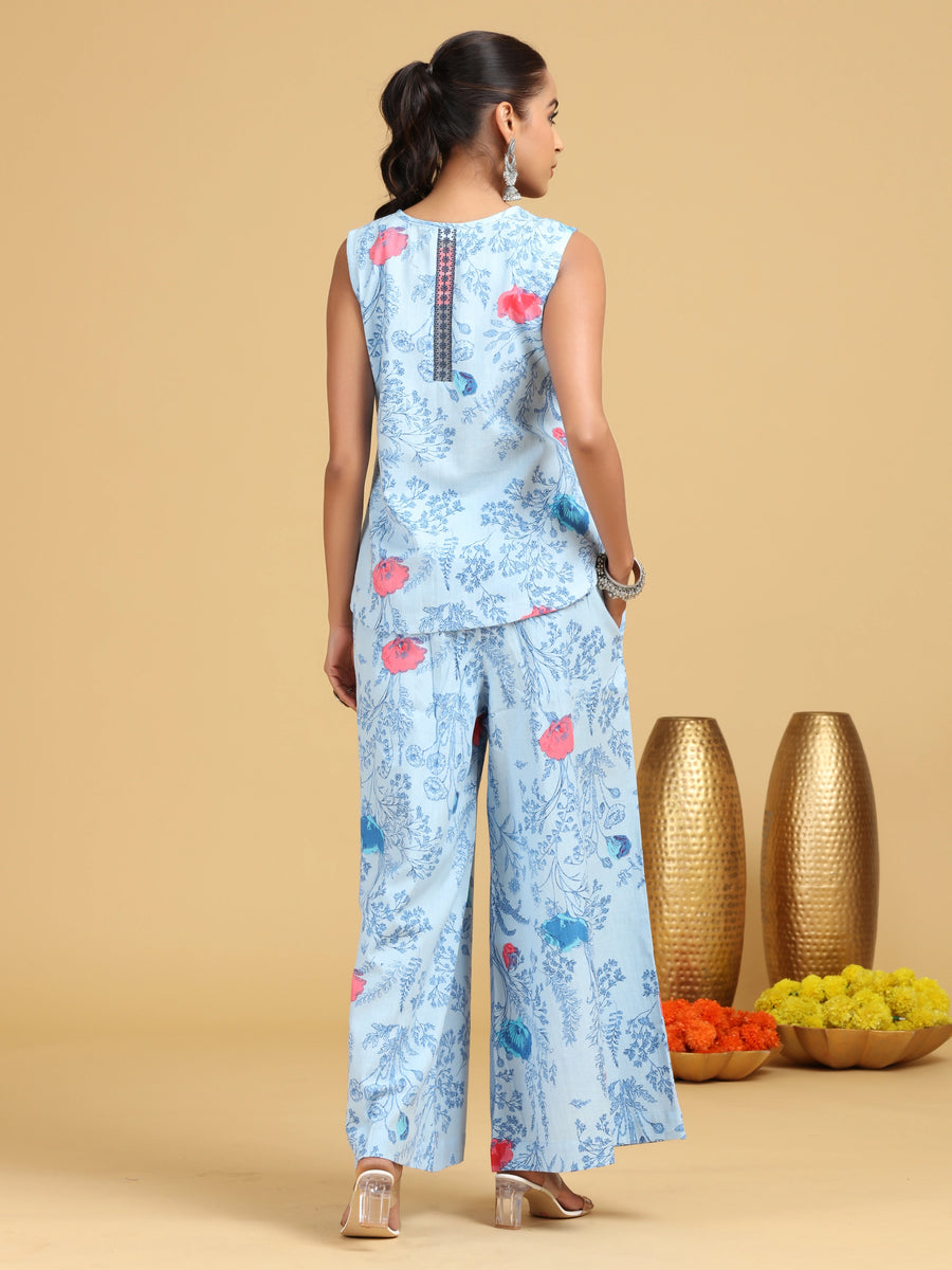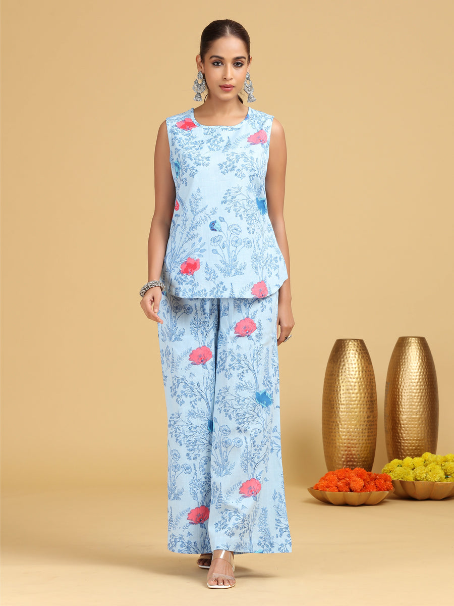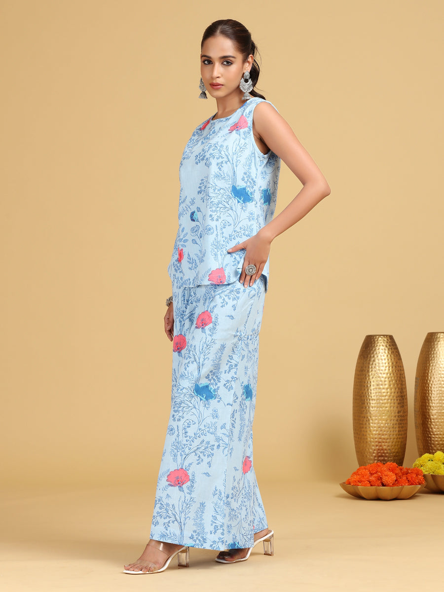 Sky blue floral printed straight co-ord set featuring a stylish sleeveless short tunic with an all-over print and comfortable elasticated pants perfect for relaxed everyday wear and effortless summer styling.