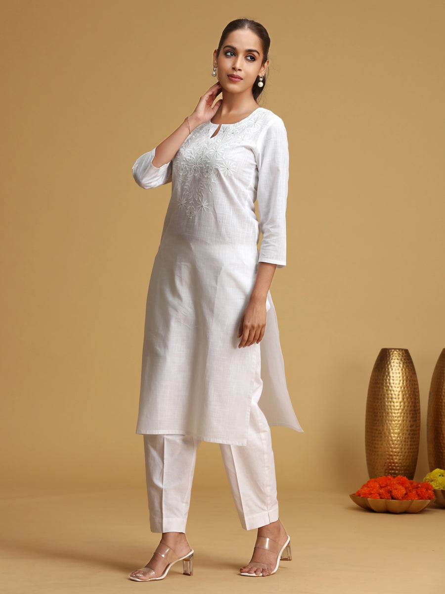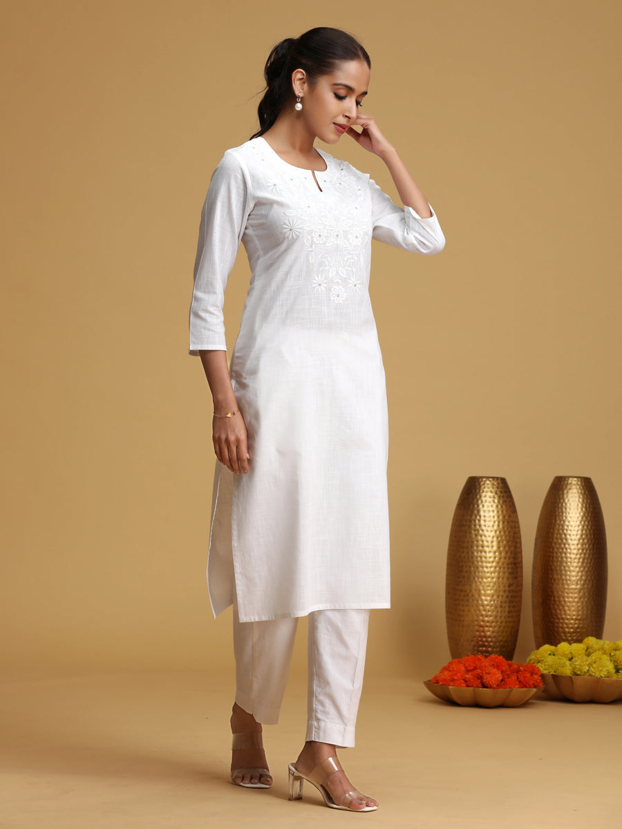 White floral embroidered straight kurta featuring a round neck, delicate embroidery, and 3/4 sleeves. Crafted in breathable cotton for everyday elegance and comfort.