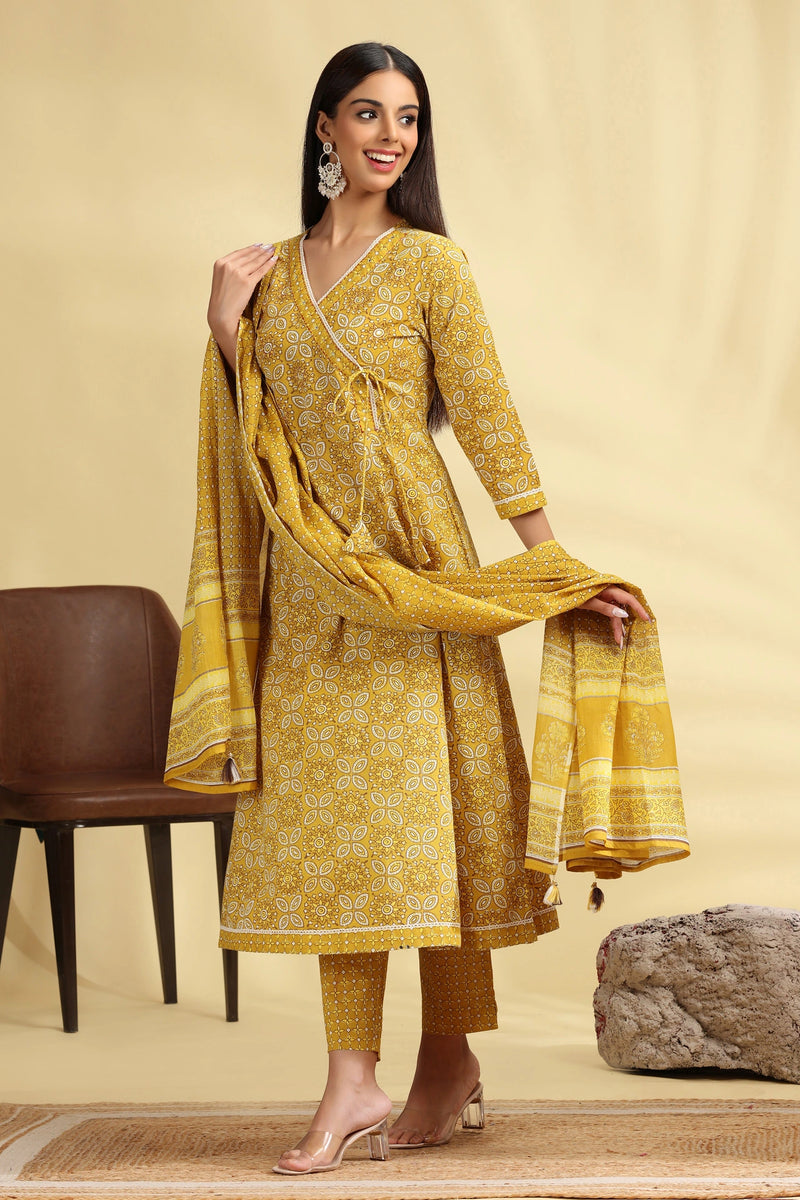 Yellow Printed Jaipuri Cotton A Line Kurta Pant Dupatta Suit Set
