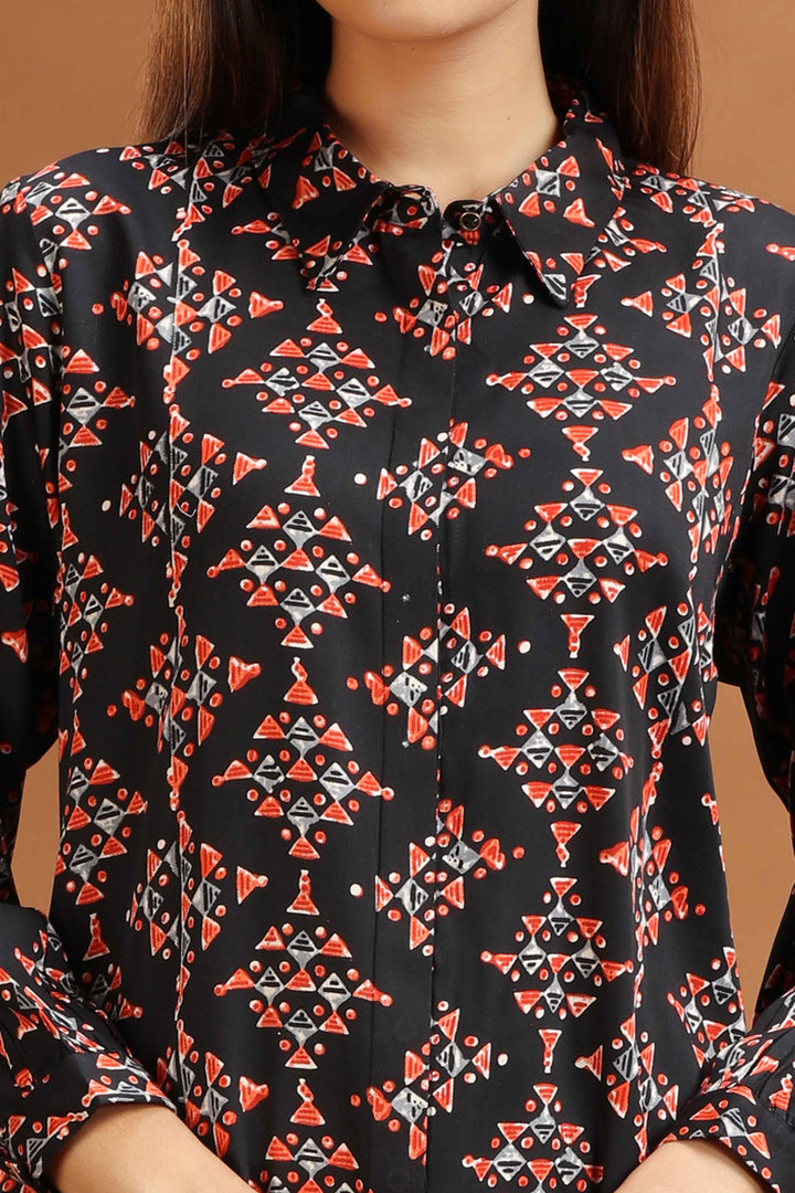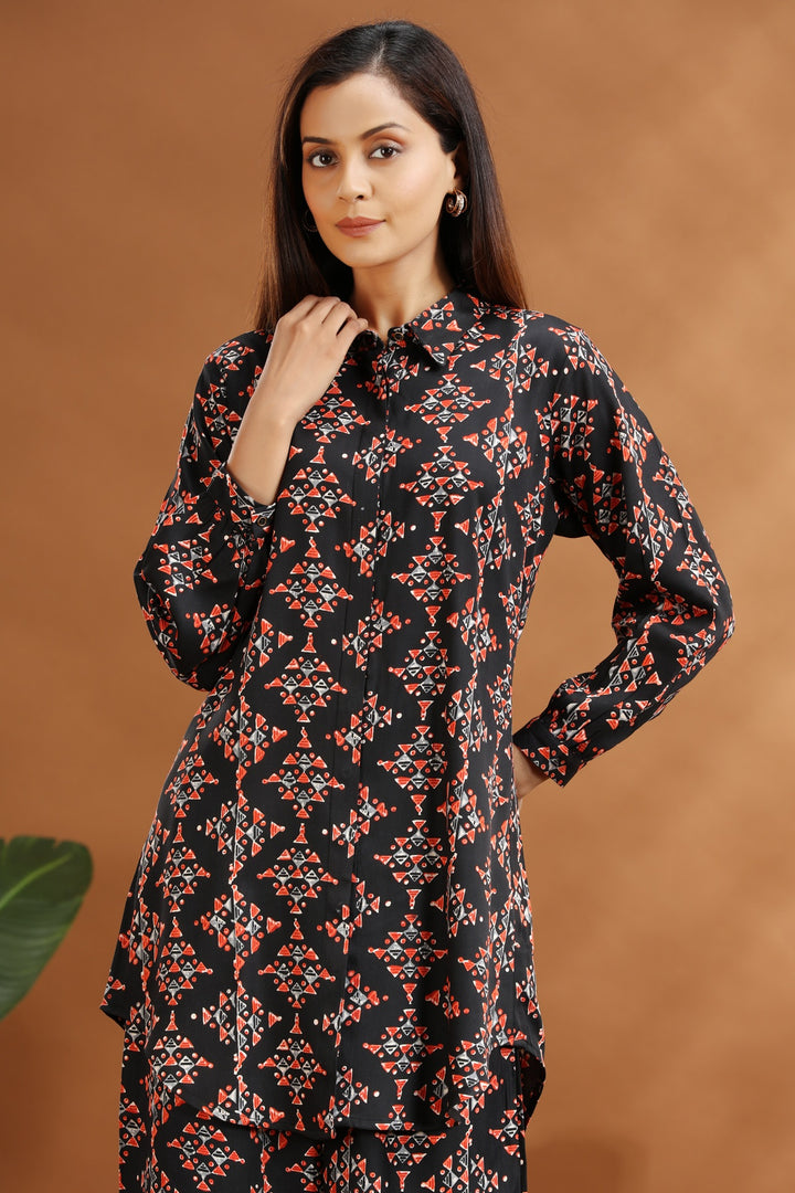 Introducing the Cotton Culture Black Rayon Straight Printed Kurta and Pant Set. Made with high-quality black rayon, this set features a beautiful print and a comfortable, straight cut. Perfect for a fashionable and cozy outfit, with a touch of style. Get yours today!