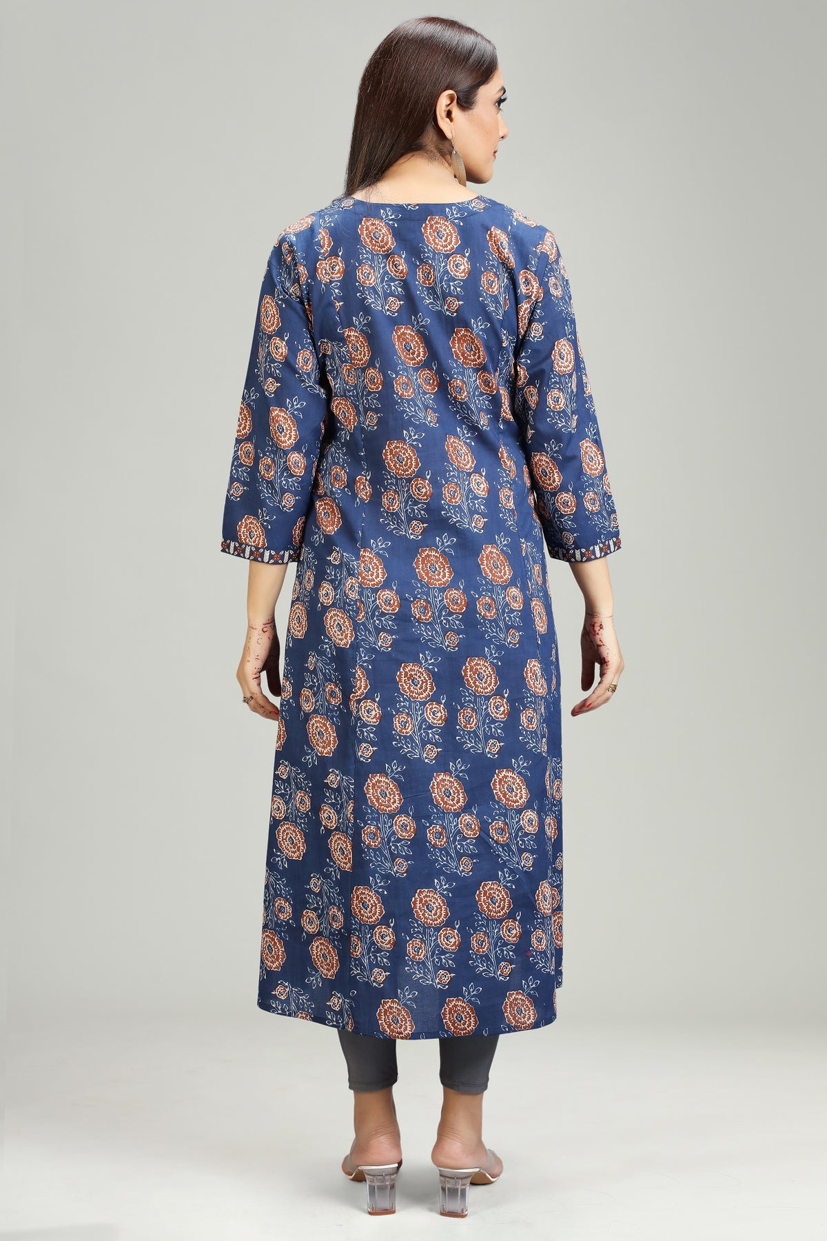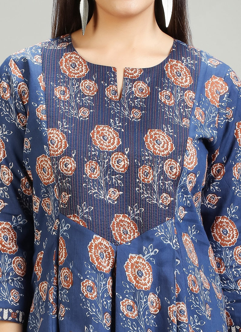 Blue Jaipuri Cotton Gathered Printed Kurta