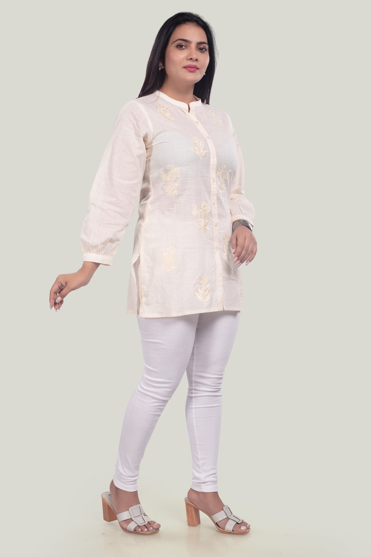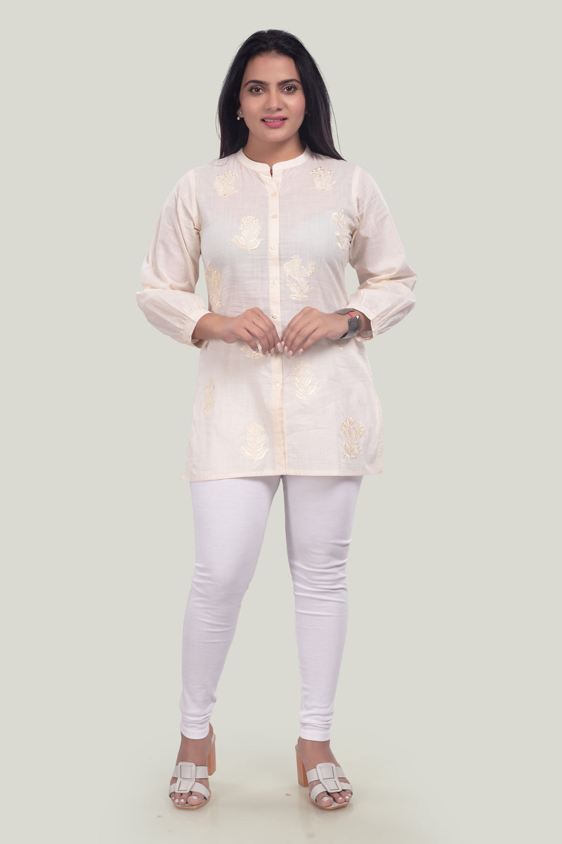 Spruce up your wardrobe with our Cream Cotton Straight Embroidered Short Kurta! Made of high-quality cotton, this kurta is both comfortable and stylish. The delicate embroidery adds a touch of elegance and the straight cut flatters all body types. Perfect for any occasion, this kurta is a must-have.