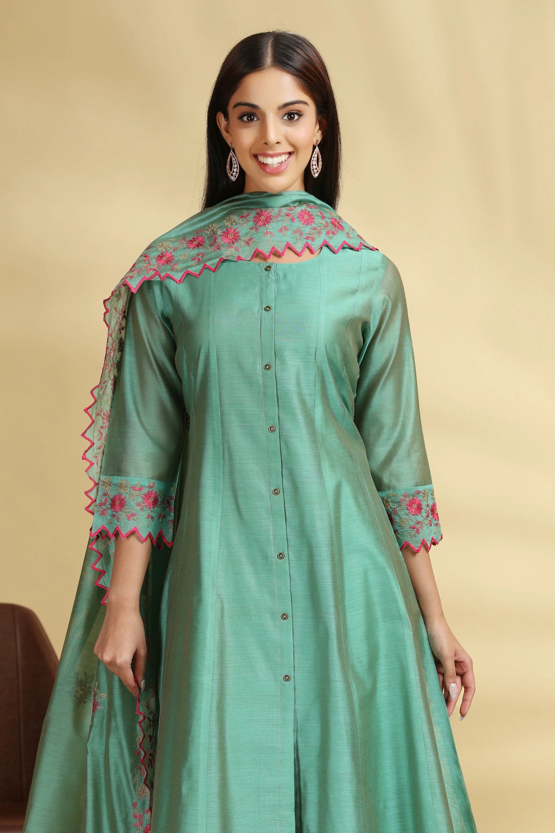 Green Embroidered Chanderi A Line Kurta Pant Dupatta Suit Set