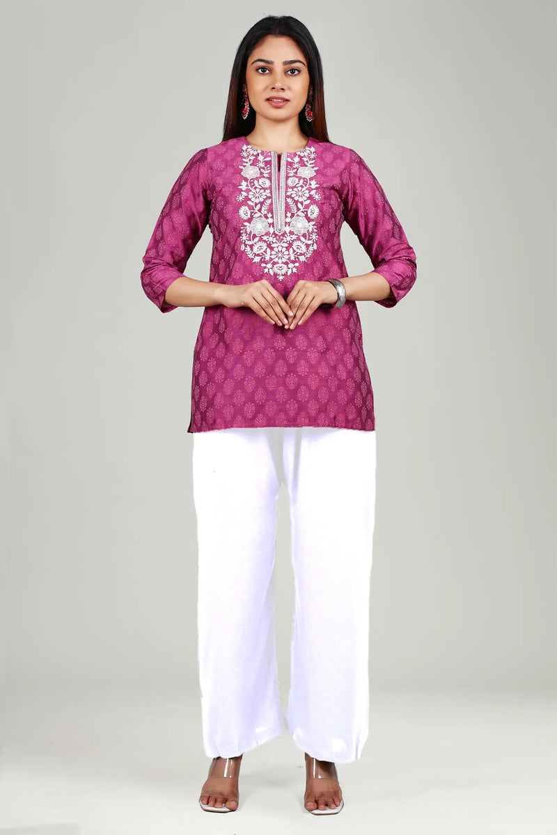 This Light Purple PolySilk Straight Embroidered Short Kurta is a blend of style and comfort. Made from high-quality PolySilk, it features intricate embroidery that adds elegance to its simple design. The straight fit of this kurta flatters your figure, making it a must-have for any wardrobe.