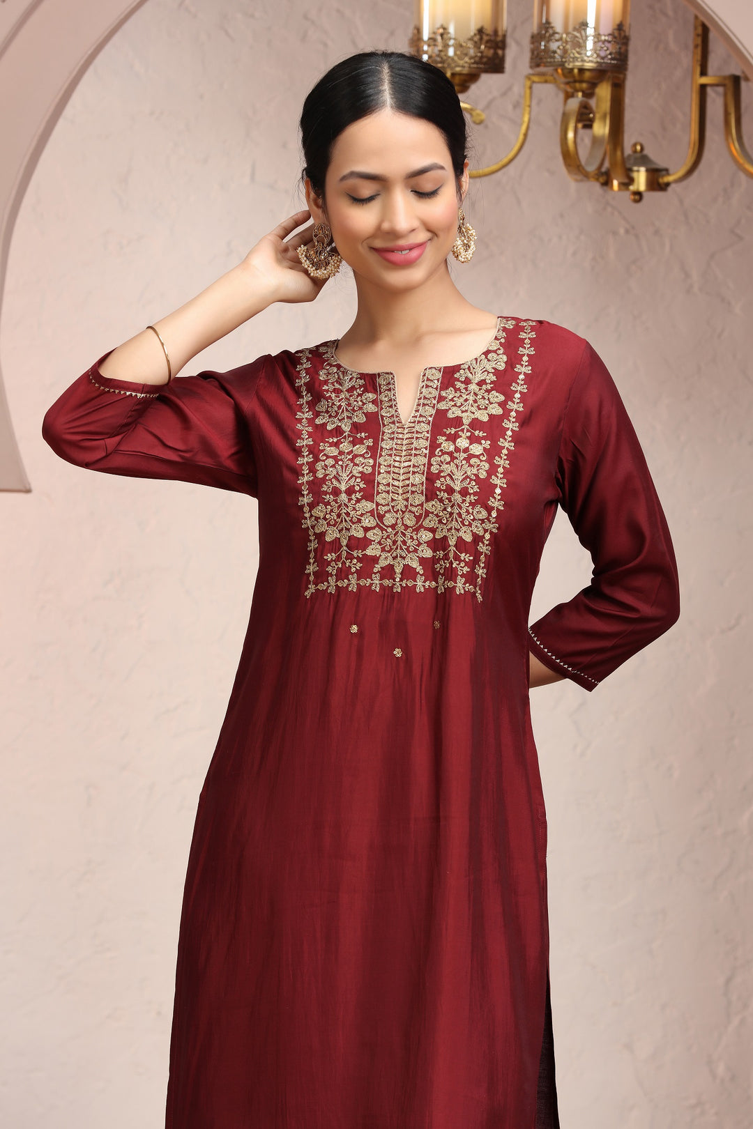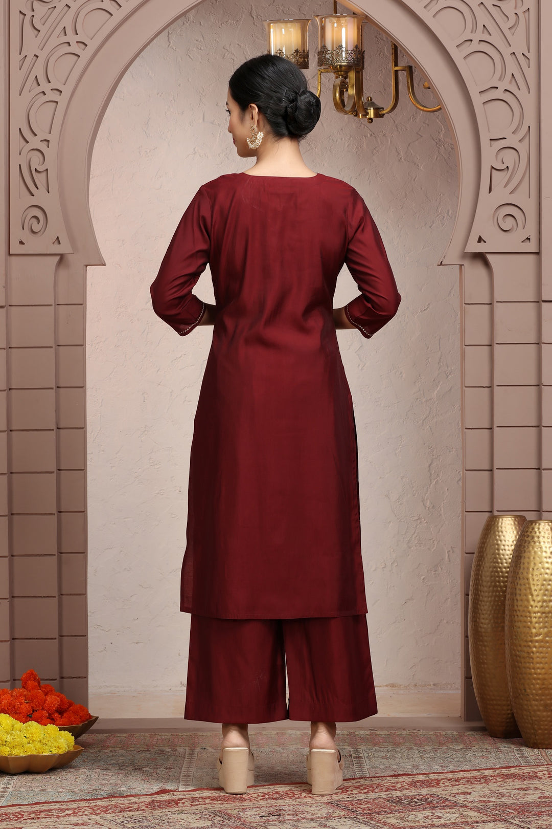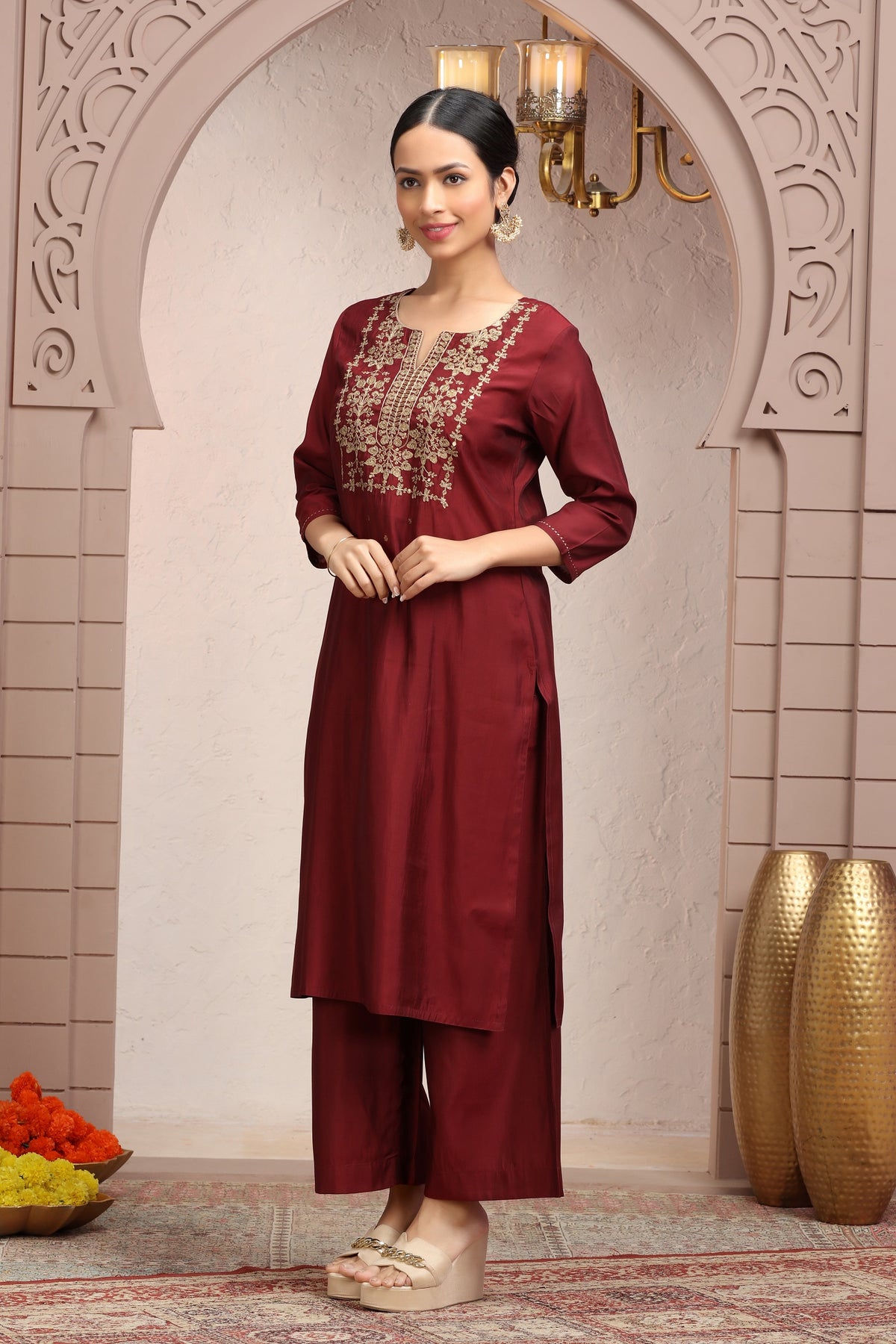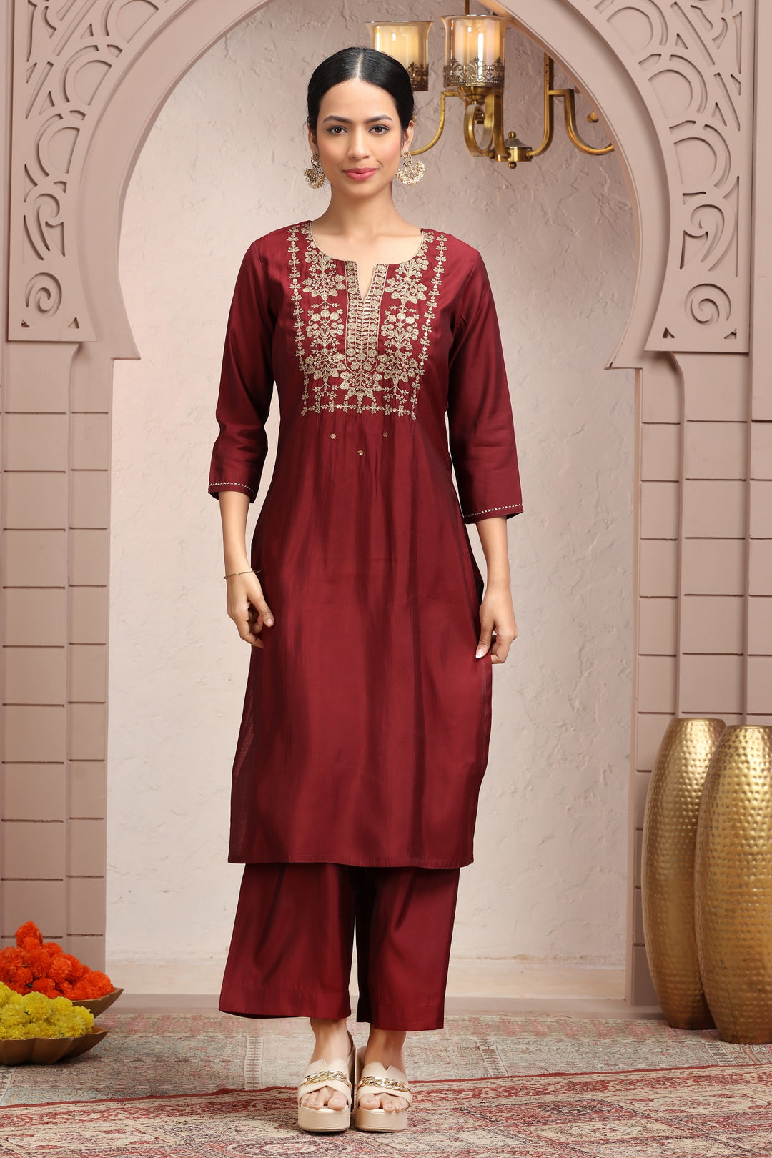Maroon Roman Silk Embroidered Straight Kurta Pant Co ord Set for women