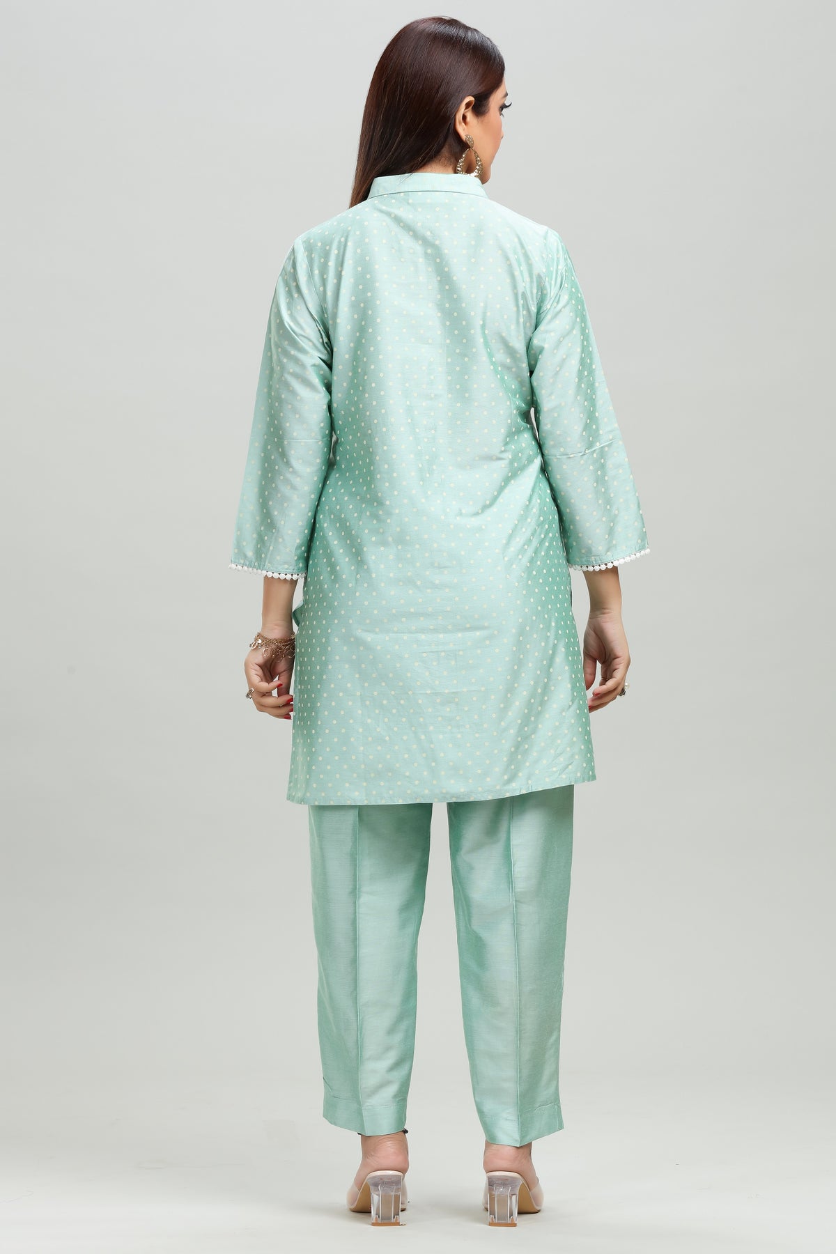 Mint Green PolySilk Straight Embroidered Kurta Pant Co ord Set