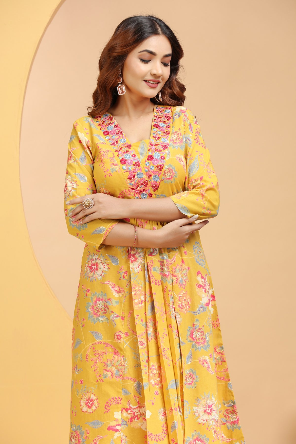 Mustard Cotton A Line Embroidered Kurta