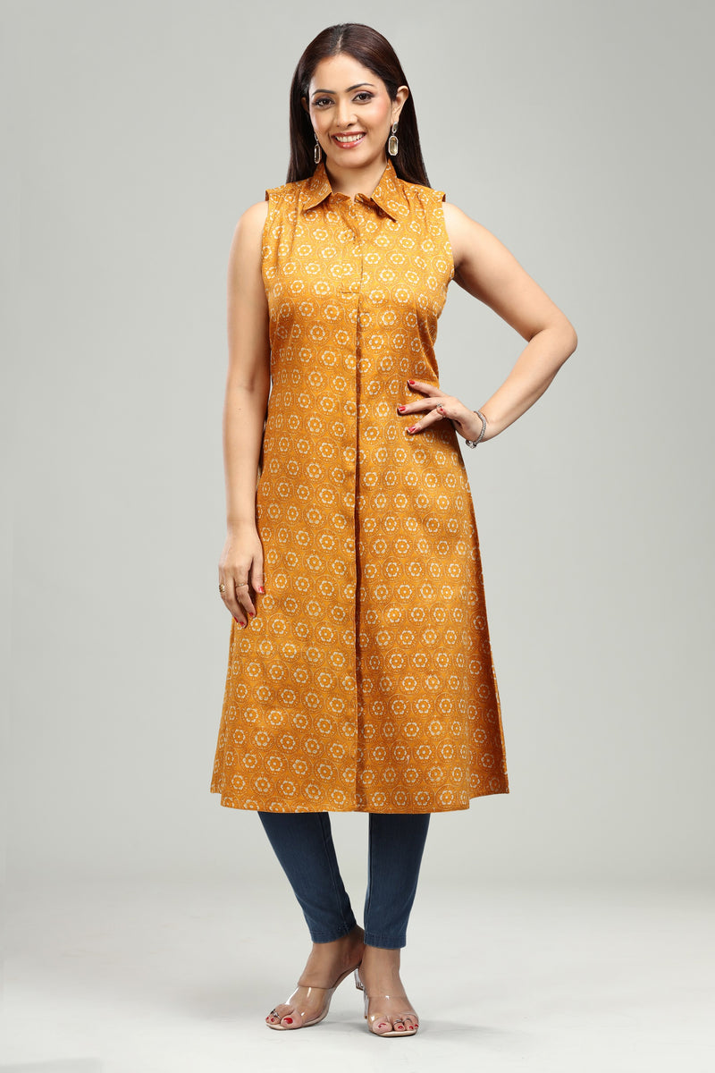 Mustard Cotton A Line Printed Sleeveless Kurta