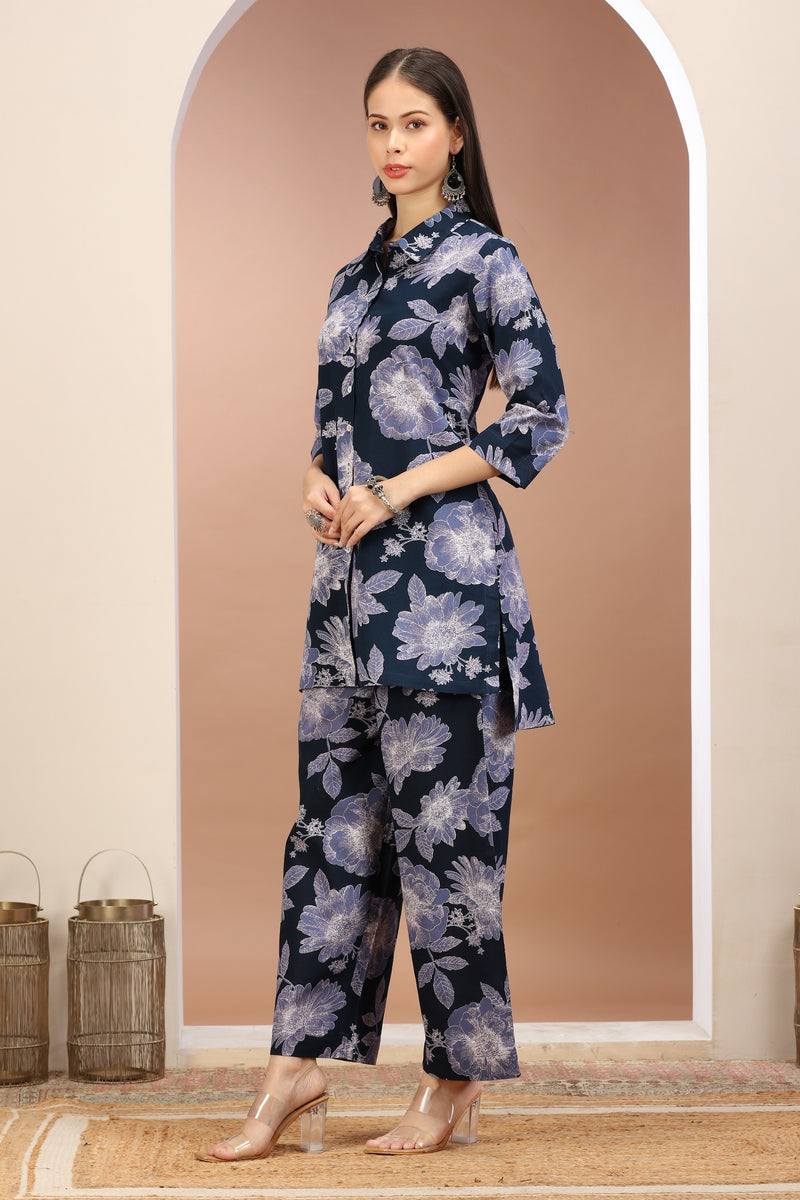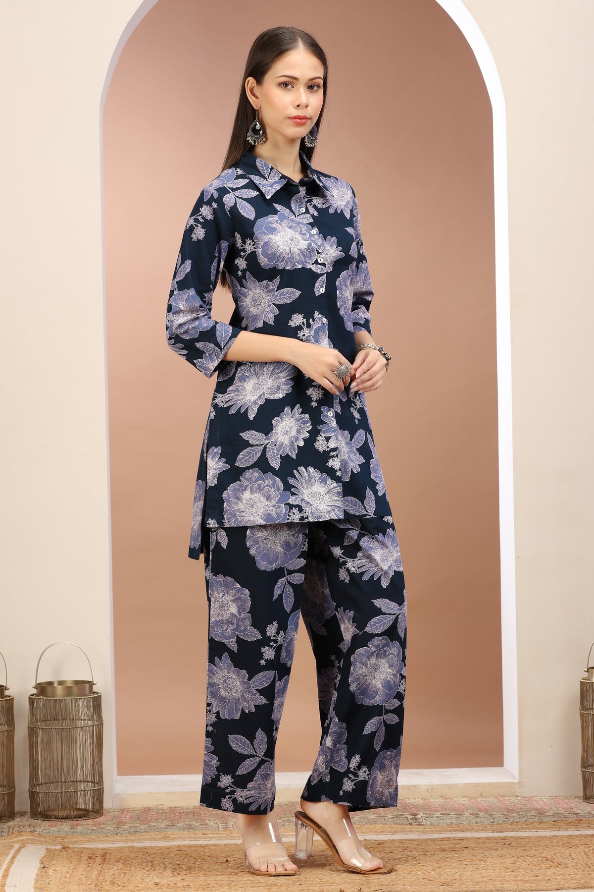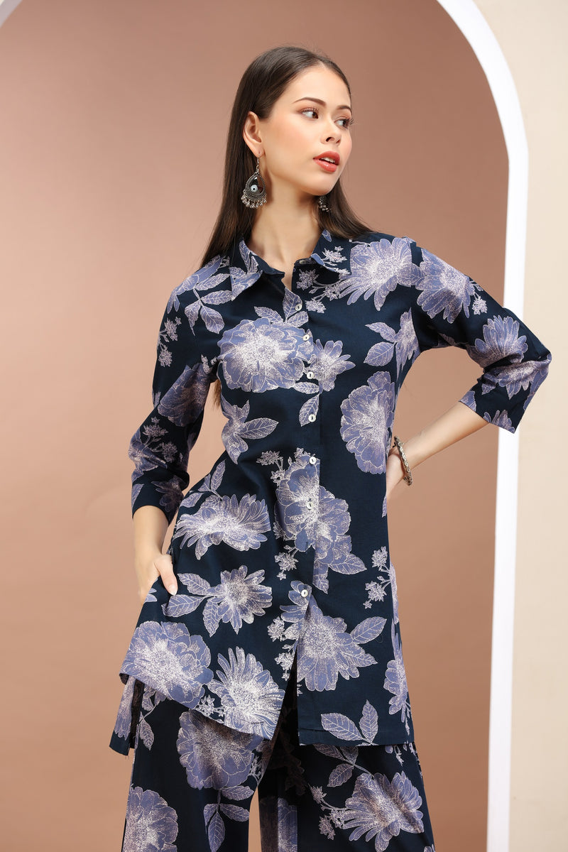 Navy Blue Flax Cotton Floral Printed Straight Kurta Pant Co ord Set for women