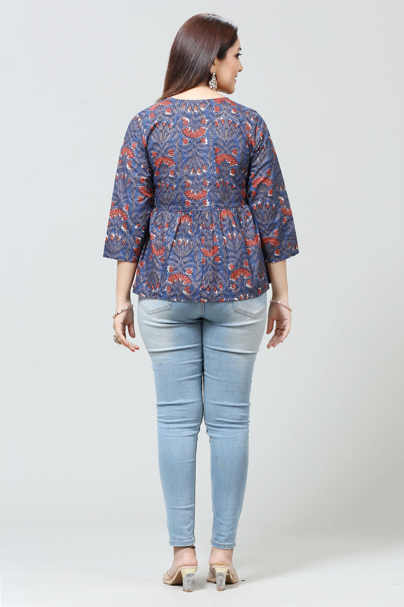 Navy Blue Jaipuri cotton Gathered Printed Short Kurta