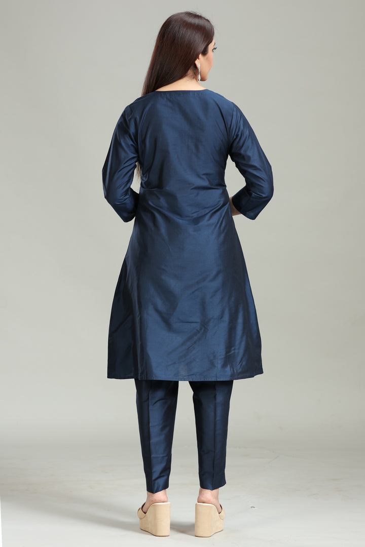 Navy Blue PolySilk A Line Embroidered Kurta Pant Co ord Set
