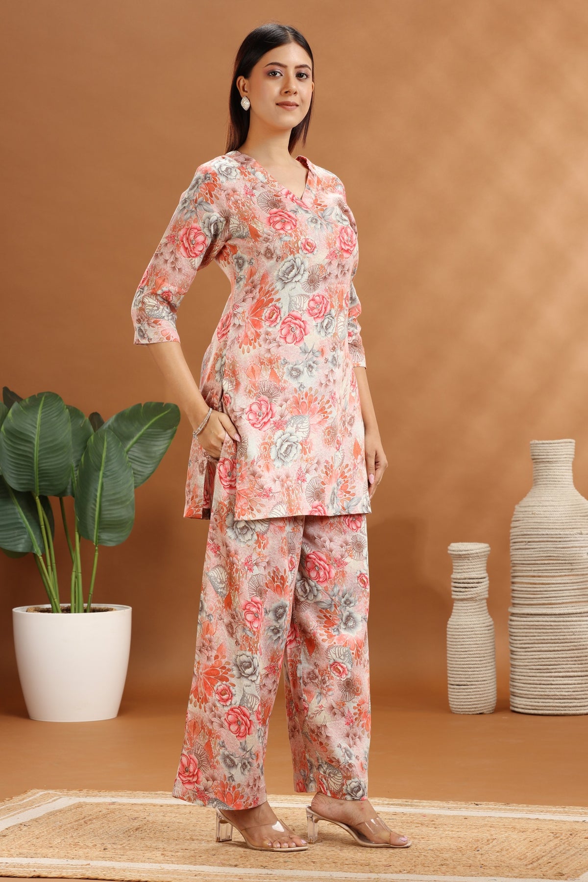 Off White & Peach Cotton Satin Printed Kurta and Pant Set