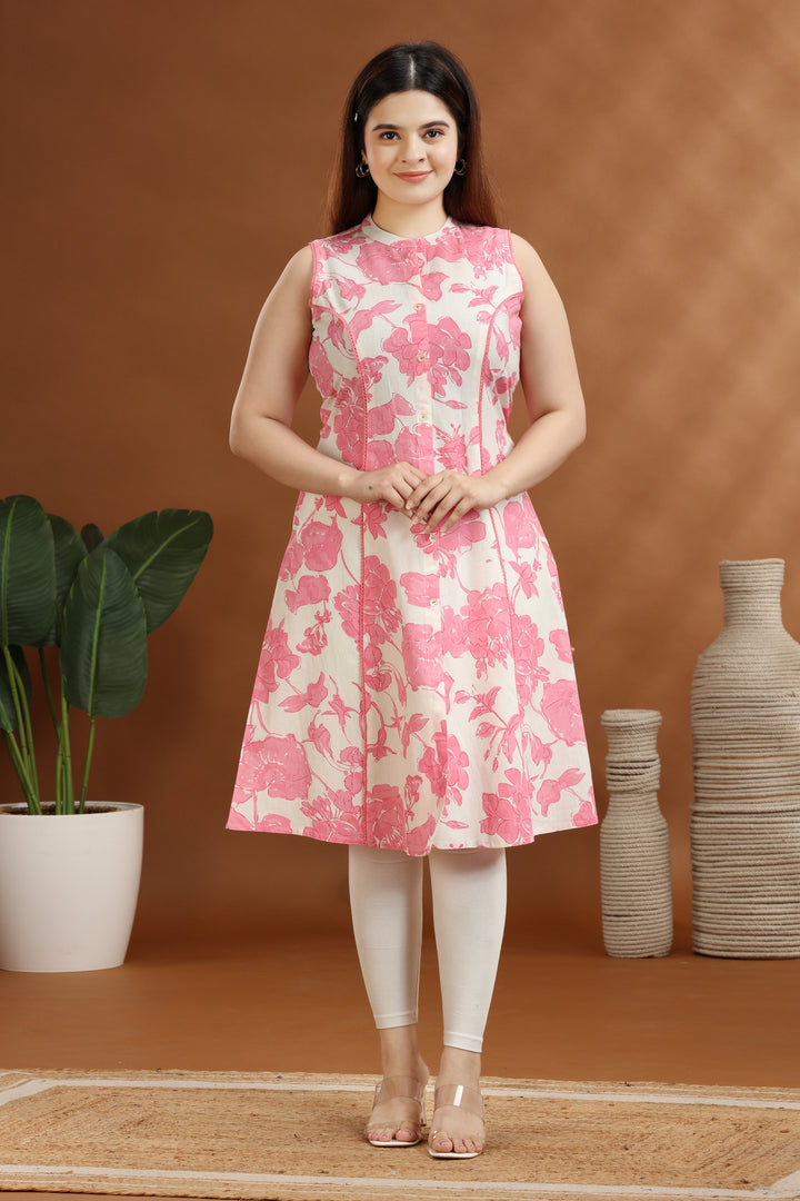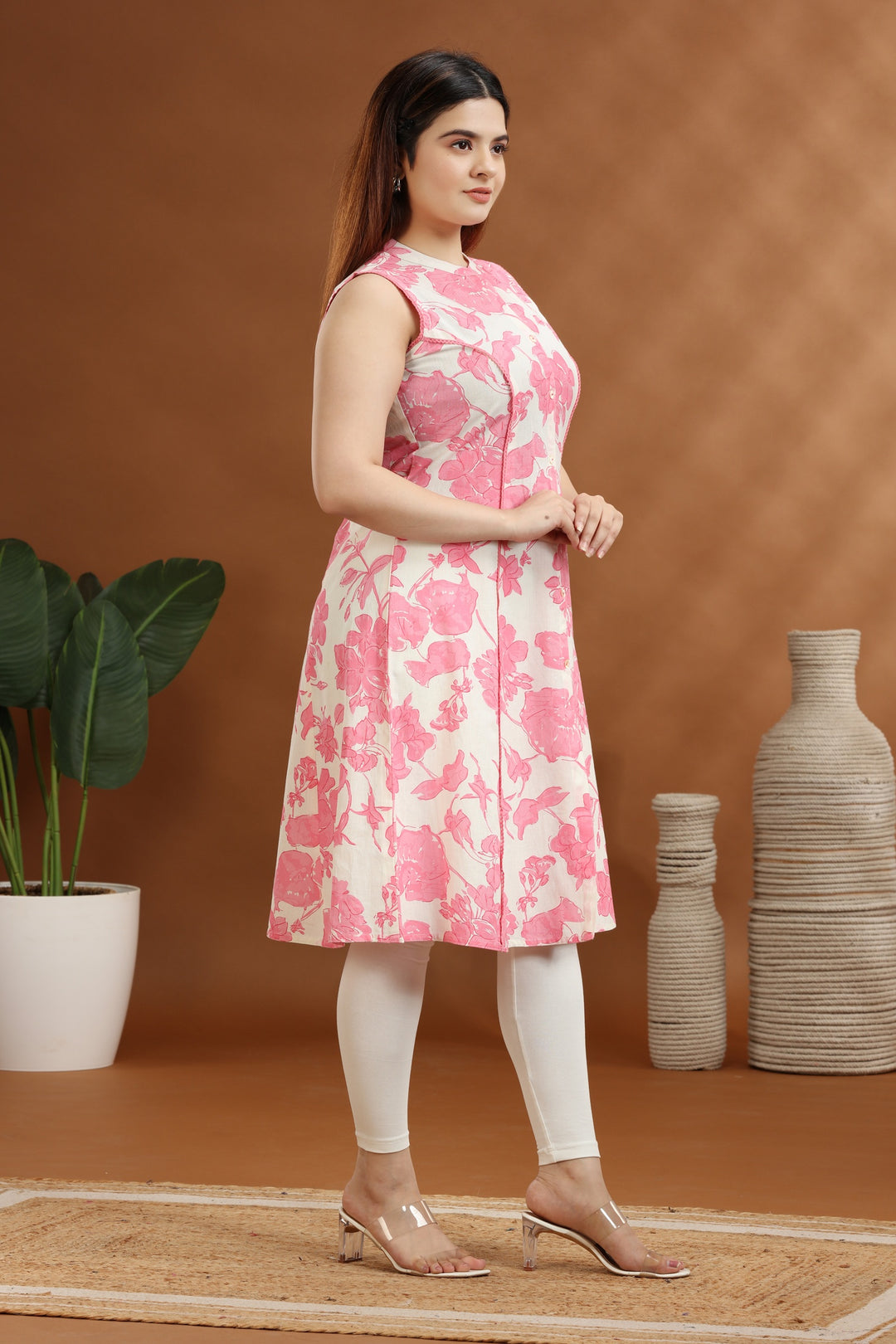 Peach & White Cotton Printed A Line Sleeveless Kurta