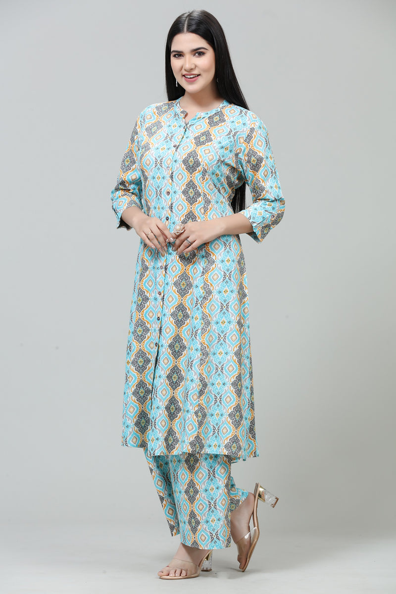 Sky Blue Poly Silk Straight Printed Kurta Pant Co ord set