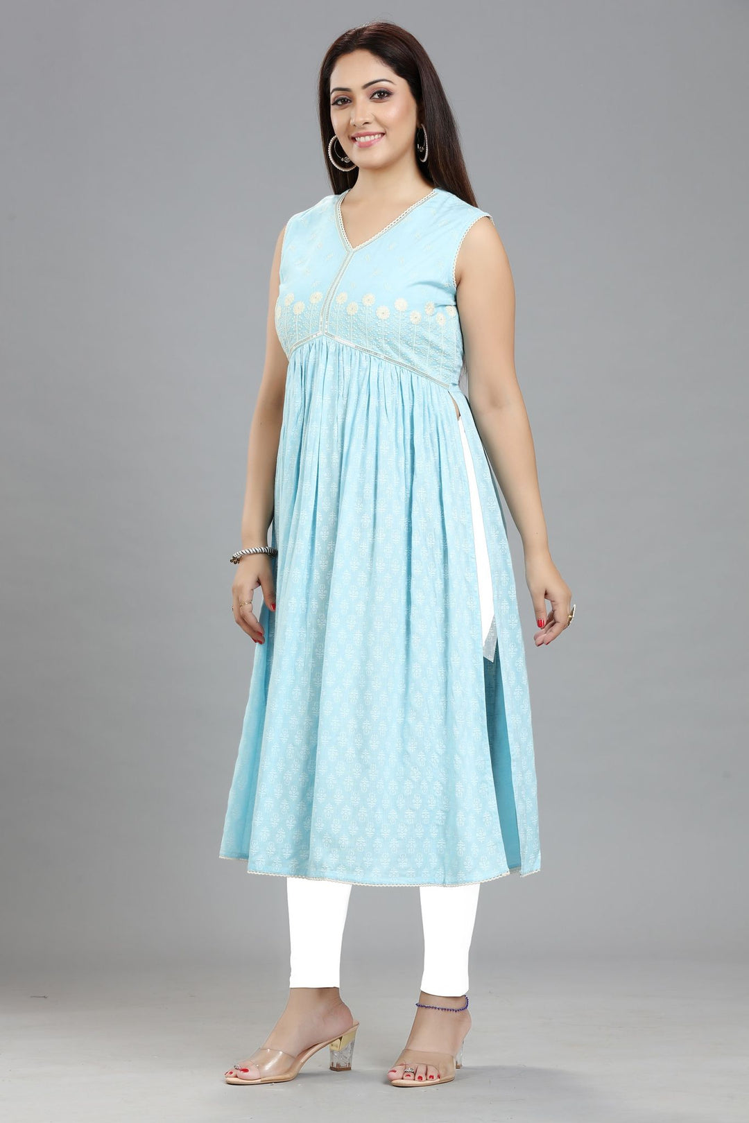 Sky Blue Rayon Gathered Embroidered Sleeveless Kurta