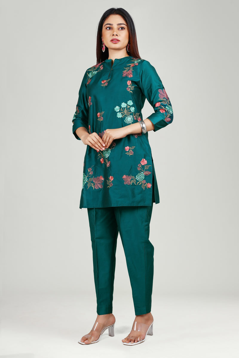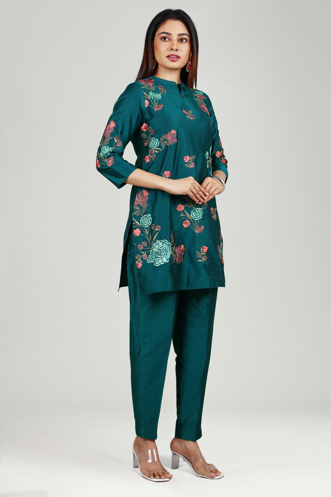 Teal PolySilk Straight Embroidered Kurta Pant Co ord Set
