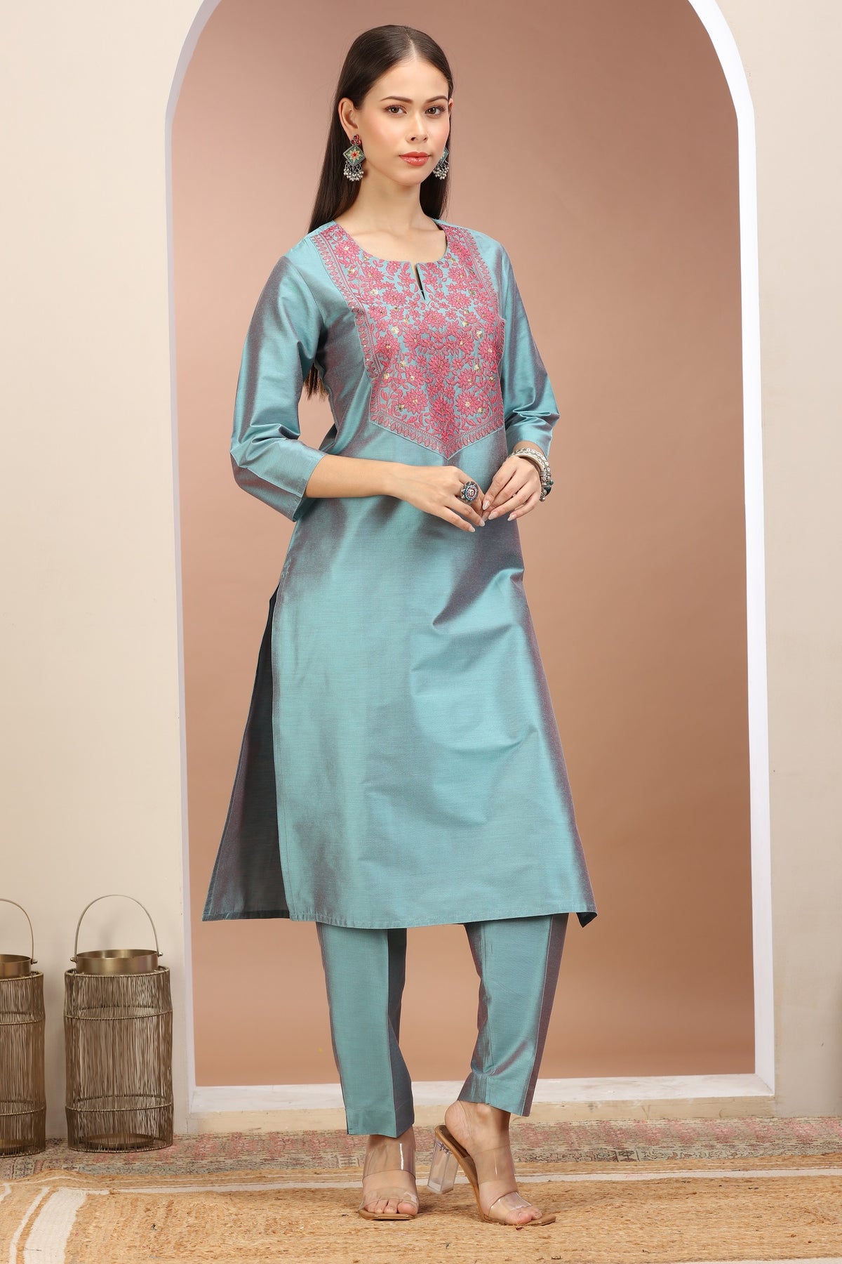 Turquoise PolySilk Embroidered Straight Kurta Pant Co ord Set
