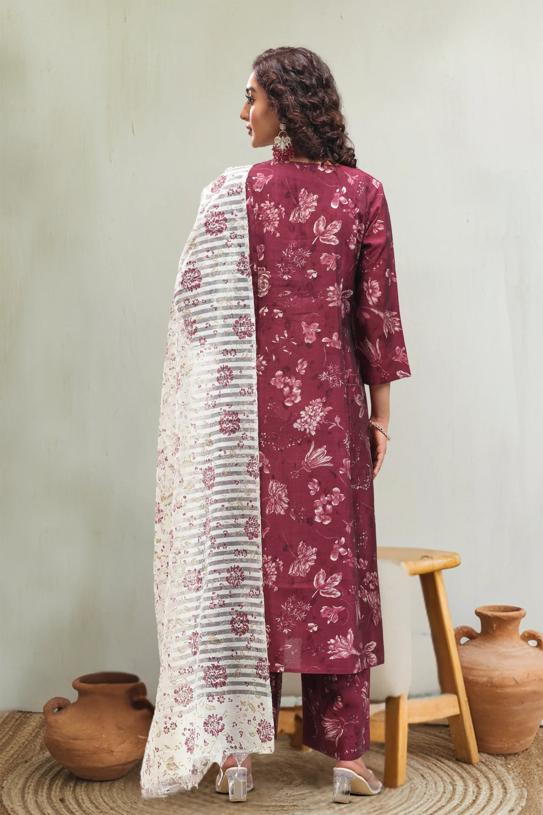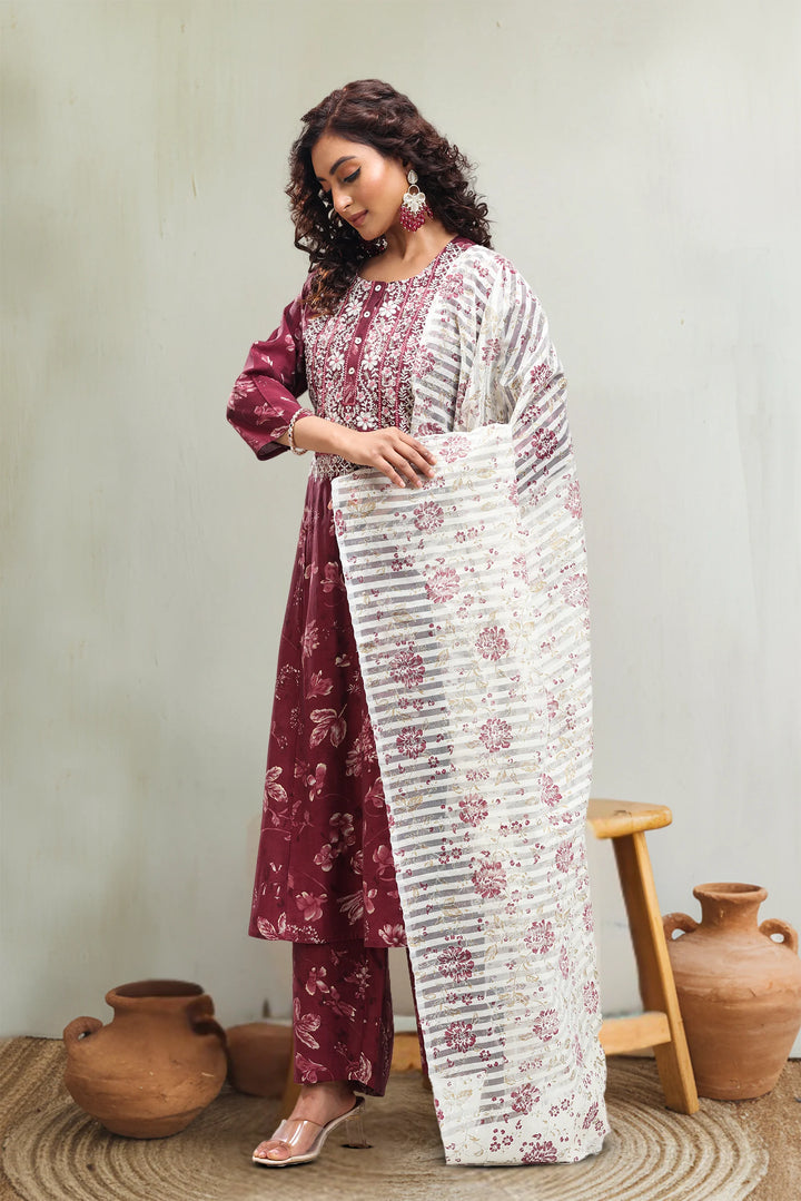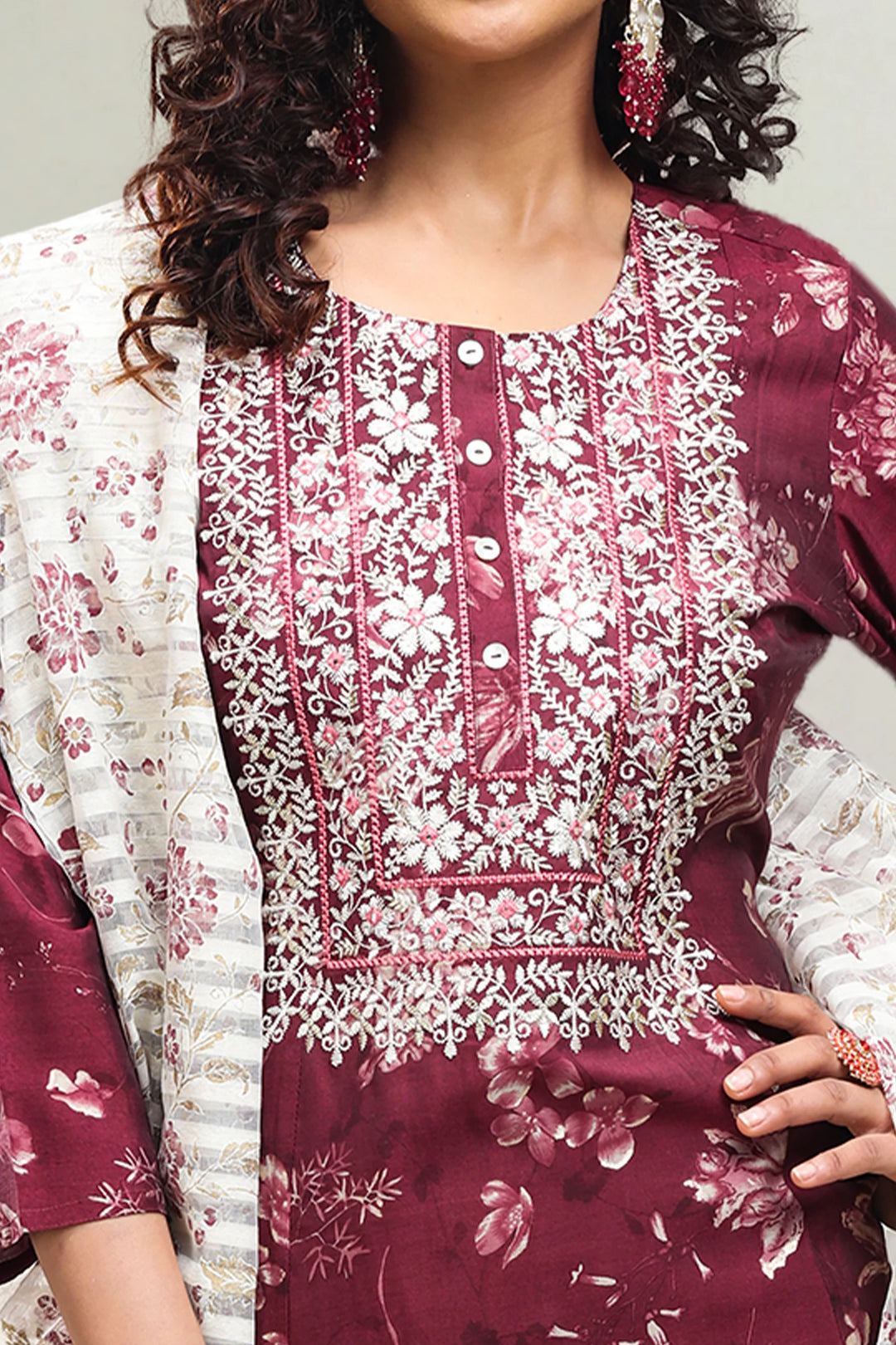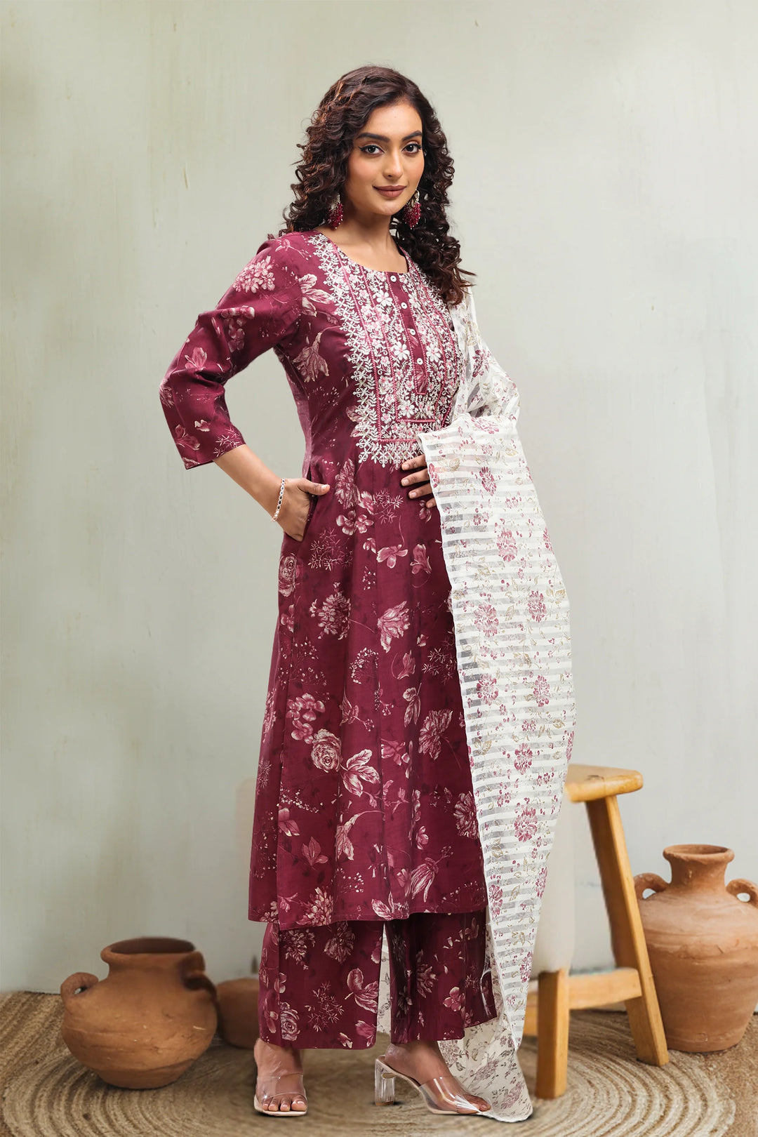 Wine Chanderi Straight Embroidered Kurta Pant Suit Set