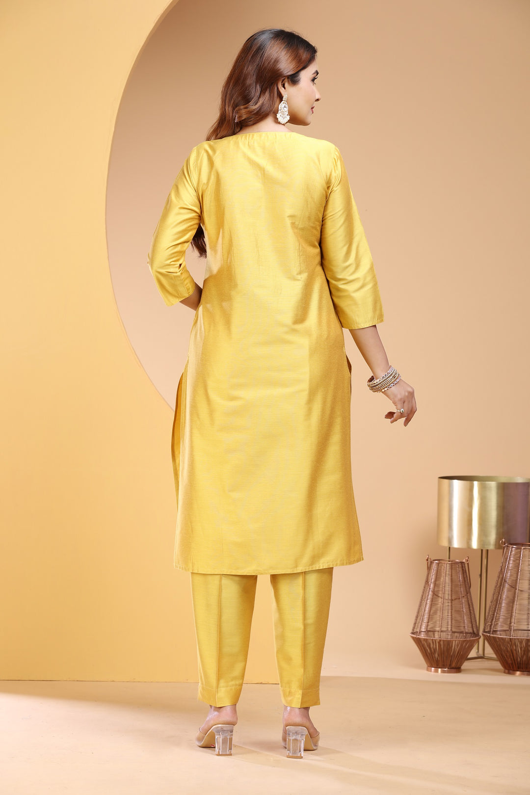Yellow PolySilk Embroidered Straight Kurta and Pant Set